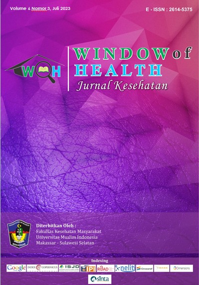 Window of Health: Jurnal Kesehatan is an open-access, peer-reviewed journal. The journal provides a platform for academics, researchers, and professionals to contribute high-quality research on health sciences. Focus and Scope of Window of Health: Jurnal Kesehatan is (Epidemiology, Health promotion and behavioral, Environmental Health, Occupational Health and Safety, Health Administration, Health Law and Policy, Hospital and Healthcare Management, Cost-Effectiveness Analysis in Public Health Interventions, Nutrition and dietetics, Reproductive Health), Medical, Nursing and Midwifery, Pharmacy, and Health Technology and Health Information Systems, and related fields. In addition, the Journal was first established in 2017 by the Institute of Study and Management Center, Journal of the Faculty of Public Health, University Muslim Indonesia, located in Makassar, South Sulawesi. Window of Health : Jurnal Kesehatan published on January, April, July and October with E-ISSN 2614-5375. This journal has also collaborated with Persatuan Sarjana Kesehatan Masyarakat Indonesia (PERSAKMI), Number: 03/KEP/PP-PERSAKMI/C/IX/2018, in terms of assisting the advancement of public health sciences and disseminating research results. Window Of Health: Journal Kesehatan has been nationally accredited and Ranked Second by the Ministry of Research, Technology, and Higher Education, Number: 200/M/KPT/2020, Regarding The scientific journals' Accreditation Ranking Of The Period 3 No 3/ 2020.