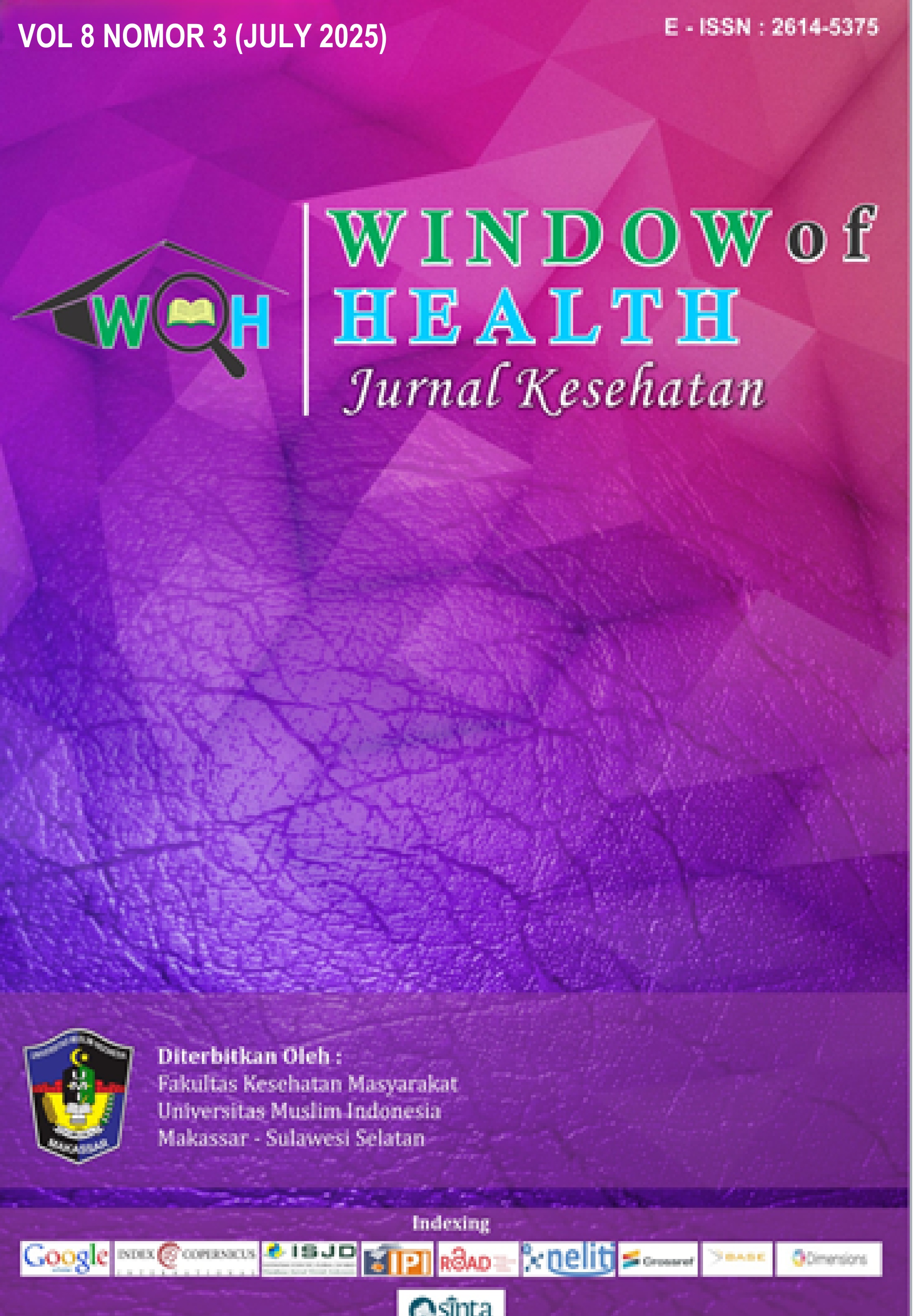 Window of Health: Jurnal Kesehatan is an open-access, peer-reviewed journal. The journal provides a platform for academics, researchers, and professionals to contribute high-quality research on health sciences. Focus and Scope of Window of Health: Jurnal Kesehatan is (Epidemiology, Health promotion and behavioral, Environmental Health, Occupational Health and Safety, Health Administration, Health Law and Policy, Hospital and Healthcare Management, Cost-Effectiveness Analysis in Public Health Interventions, Nutrition and dietetics, Reproductive Health), Medical, Nursing and Midwifery, Pharmacy, and Health Technology and Health Information Systems, and related fields. In addition, the Journal was established in 2017 by the Institute of Study and Management Center Journal of the Faculty of Public Health, Universitas Muslim Indonesia, located in Makassar, South Sulawesi. The Window of Health: Jurnal Kesehatan was published in January, April, July, and October with E-ISSN 2614-5375. This journal has also collaborated with Persatuan Sarjana Kesehatan Masyarakat Indonesia (PERSAKMI), Number: 46/C/PENGDA-PERSAKMI-SULSEL/IV/2025, in terms of assisting the advancement of public health sciences and disseminating research results. Window Of Health: Jurnal Kesehatan has been nationally accredited Rank and Second by the Ministry of Research, Technology, and Higher Education, Number: 200/M/KPT/2020, Regarding the scientific journals Accreditation Ranking Of The Period 3 No 3/ 2020.